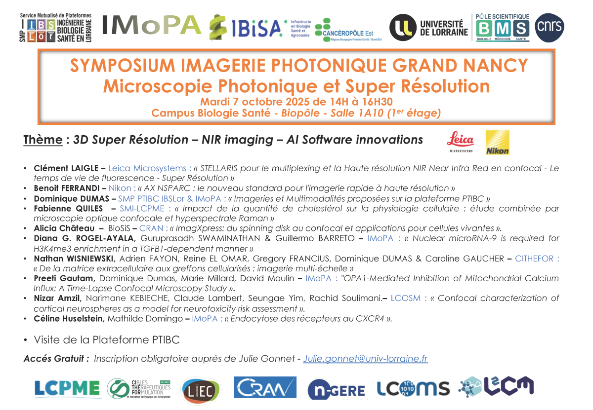 La plateforme Imagerie du Service Mutualisé de Plateformes IBSLOR (Pôle scientifique BMS) et l'équipe RemPaCOAT de l'UMR7365 IMoPA organisent le 7 octobre 2025 de 14h à 16h30 un symposium autour de l'imagerie. Cet évènement aura lieu au Biopôle - Salle 1A10.